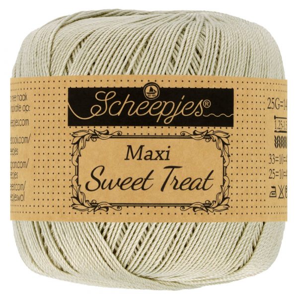 Je zoekt een dun haak of brei garen, een Grijs katoen met mooie heldere kleuren wat met een kleine naald te verwerken is. Bekijk dan deze Scheepjes Maxi Sweet Treat 248 Champagne. Een prachtig garen wat met naald 1,25 of 1,5 te haken of breien is. Scheepjes Maxi Sweet Treat is evenals Scheepjes Maxi Sugar Rush een zeer fijn (garendikte Lace) gemerceriseerd garen van 100% katoen. Scheepjes Maxi Sweet Treat heeft een subtiel glansje en een sterk getwijnde draad, waardoor het brei- of haakwerk een fraaie gladde afwerking krijgt. Dit fijne garen is ideaal voor opengewerkte brei- of haakpatronen, zoals ajourbreien, kantbreien of filethaakwerk, maar natuurlijk ook voor luchtige kleding of accessoires. Bij de productie is gebruikgemaakt van een volledig biologische afvalwaterzuivering, waardoor het gebruikte water op een veilige manier wordt gerecycled en hergebruikt. Scheepjes Maxi Sweet Treat heeft het EN 71-3 keurmerk, wat aangeeft dat dit garen veilig is in gebruik voor personen met een gevoelige huid en met name voor speelgoed voor baby’s en kinderen. Dat maakt dit garen tot een verantwoorde keus voor bijvoorbeeld babydekentjes, knuffels of amigurumi. Scheepjes Maxi Sweet Treat, Maxi Sugar Rush en Maxi zijn identieke garens, maar elk met een andere looplengte. Scheepjes Maxi Sweet Treat is verkrijgbaar in 87 verschillende kleuren. De aanbevolen naalddikte is 1.25-1.50mm. Een bol weegt 25 gram en heeft een looplengte van 140 meter.