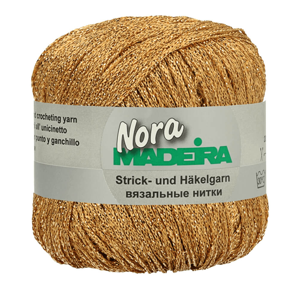 Madeira Nora is een gemetalliseerd haak- en breigaren dat verrassend zacht en soepel is. Het is gemaakt van 80% viscose en 20% gemetalliseerd polyester en glinstert erg mooi. Met dit garen worden prachtige kerstversieringen gemaakt en bij brei- en haakwerk fonkelende accenten gezet. Het garen is wasbaar tot 30°C en geschikt voor het drogen in de droger bij lage temperaturen. Elke bol Madeira Nora van 25 gram heeft een looplengte van ongeveer 100 meter en is verkrijgbaar in verschillende kleuren. Geschikt voor pendikte 2.50-3.00mm.