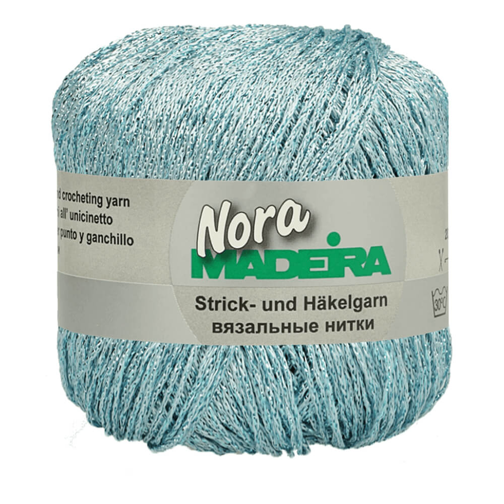 Madeira Nora is een gemetalliseerd haak- en breigaren dat verrassend zacht en soepel is. Het is gemaakt van 80% viscose en 20% gemetalliseerd polyester en glinstert erg mooi. Met dit garen worden prachtige kerstversieringen gemaakt en bij brei- en haakwerk fonkelende accenten gezet. Het garen is wasbaar tot 30°C en geschikt voor het drogen in de droger bij lage temperaturen. Elke bol Madeira Nora van 25 gram heeft een looplengte van ongeveer 100 meter en is verkrijgbaar in verschillende kleuren. Geschikt voor pendikte 2.50-3.00mm.