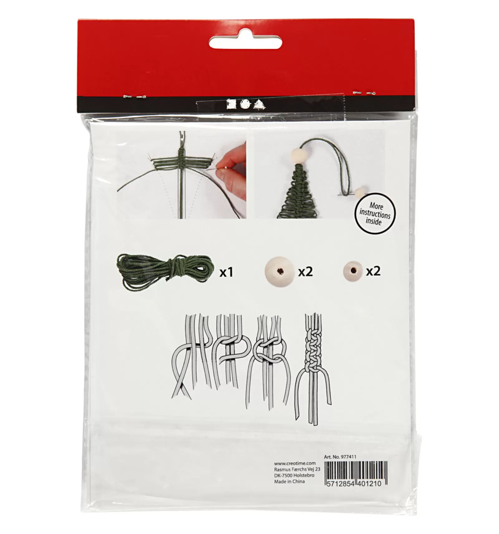 Materialenset voor 2 macramé kerstbomen met decoratieve houten kralen om op te hangen..