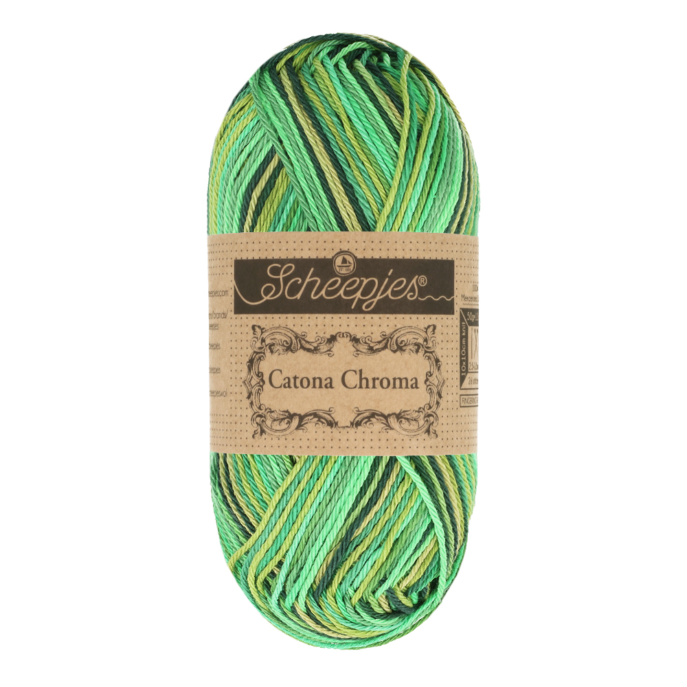 Scheepjes Catona Chroma betovert met zijn prachtige veelkleurige variatie op het extreem geliefde Scheepjes Catona. Beide garens delen niet alleen dezelfde samenstelling en kwaliteit, maar ook de acht nieuwe kleurvariaties van Catona Chroma zijn gebaseerd op de bestaande kleuren van de Catona-serie. Hierdoor kun je deze garens perfect combineren en je projecten een verrassend kleuraccent geven. Hieronder vind je een overzicht van elke Catona Chroma kleurstelling met de bijbehorende Catona kleurnummers: